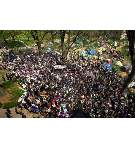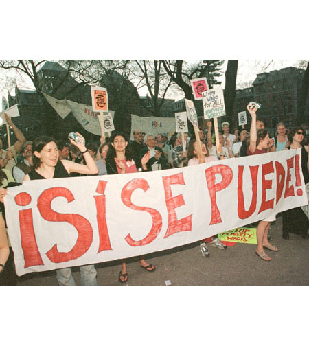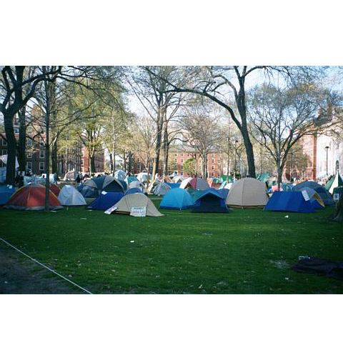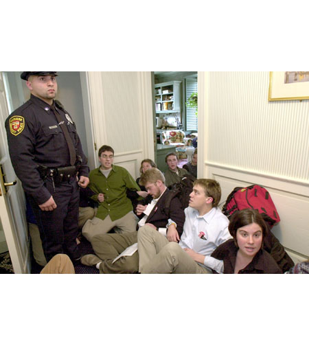After three years of urging Harvard to reverse wage cuts, fifty of us staged a sit-in in Massachusetts Hall, the Office of the President. We refused to leave until the school reversed cuts in wages and benefits, stopped outsourcing, and agreed to a living wage policy. Neil Rudenstine, the school's President, said he would resign before he negotiated, but after three weeks, Harvard agreed to re-negotiate all contracts with service workers. In exchange, we agreed to leave the building.